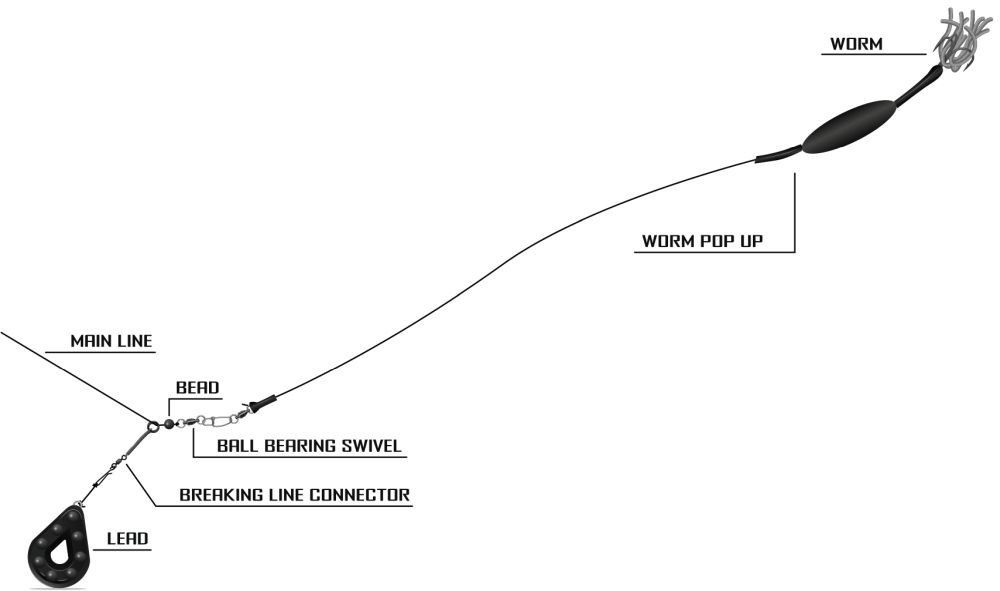 Medzi podvodným plavákom a trojháčikom je namontovaná stužujúca gumová hadička, ktorá slúži ako „držiak odstupu“ a chráni pred zamotaním. Náväzec „Worm Pop Up Rig“ sa výborne hodí pre rybárov loviacich z brehu, ktorí chcú svoju montáž na riekach či jazerách nahadzovať.