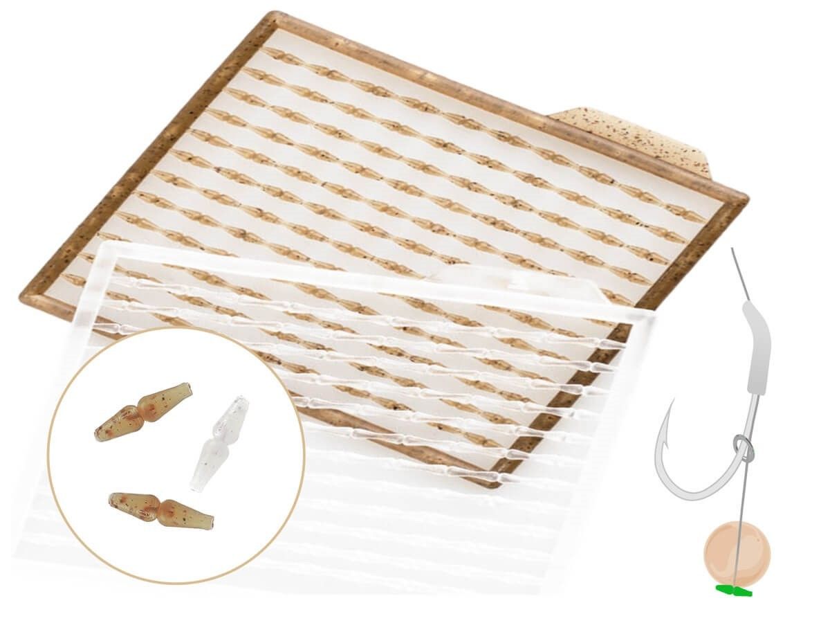 Balenie obsahuje dve sady zarážok: Jednu číru a druhú transparentnú hnedú pre dokonalé prispôsobenie nástrahe.