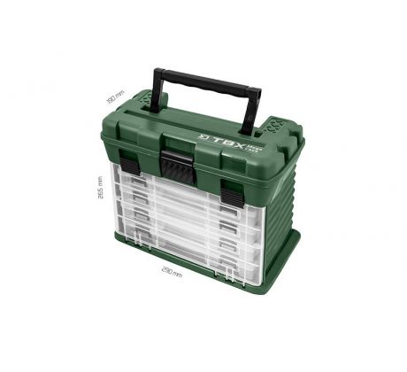 Rozmer priehradky: 1x(26,5x16x7cm), 4x plastová krabička o rozmere 23,5x12,7x3,2cm s 3x vnútornými priehradkami 22,5x3,5x2,7cm a 10x prepážka