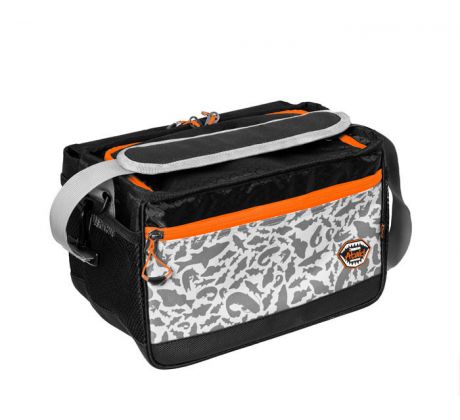 Kvalitné vonkajšie zipsy oranžovej farby sú vybavené plastovým ťaháčikom na oranžovom popruhu, ktorý je na konci rozšírený, a preto je možné ho rýchlo uchopiť. Doplnky oranžovej farby umožňujú rybárovi, aby bola taška dobre viditeľná aj za šera a vedel ju okamžite nájsť. Taška je ušitá z ľahkej, ale pritom odolnej látky čiernej farby. Vybavená je sivým popruhom určeným pre nosenie cez rameno. Dizajn tašky dopĺňa naša jedinečná sivá ATAK! kamufláž so siluetami dravých rýb.